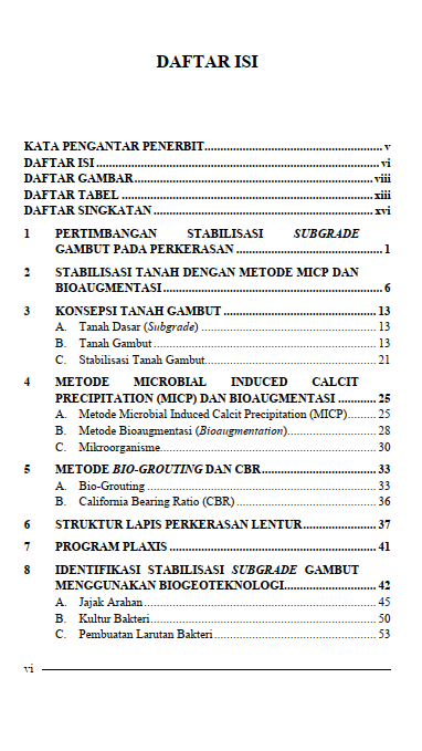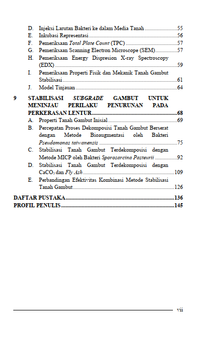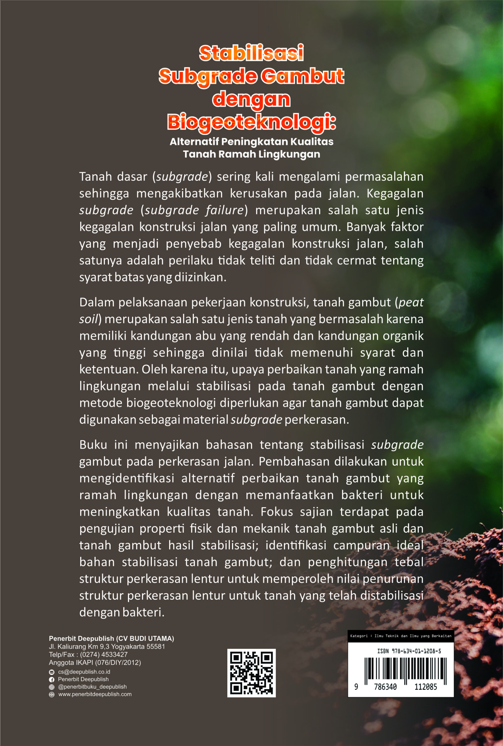 Sinopsis Buku Stabilisasi Subgrade Gambut dengan Biogeoteknologi: Alternatif Peningkatan Kualitas Tanah Ramah Lingkungan Buku Stabilisasi Subgrade Gambut dengan Biogeoteknologi: Alternatif Peningkatan Kualitas Tanah Ramah Lingkungan Buku Teknik yang berjudul Buku Stabilisasi Subgrade Gambut dengan Biogeoteknologi: Alternatif Peningkatan Kualitas Tanah Ramah Lingkungan merupakan karya Dewi Amalia, dkk. Tanah dasar (subgrade) sering kali mengalami permasalahan sehingga mengakibatkan kerusakan pada jalan. Kegagalan subgrade (subgrade failure) merupakan salah satu jenis kegagalan konstruksi jalan yang paling umum. Banyak faktor yang menjadi penyebab kegagalan konstruksi jalan, salah satunya adalah perilaku tidak teliti dan tidak cermat tentang syarat batas yang diizinkan. Dalam pelaksanaan pekerjaan konstruksi, tanah gambut (peat soil) merupakan salah satu jenis tanah yang bermasalah karena memiliki kandungan abu yang rendah dan kandungan organik yang tinggi sehingga dinilai tidak memenuhi syarat dan ketentuan. Oleh karena itu, upaya perbaikan tanah yang ramah lingkungan melalui stabilisasi pada tanah gambut dengan metode biogeoteknologi diperlukan agar tanah gambut dapat digunakan sebagai material subgrade perkerasan. Buku ini menyajikan bahasan tentang stabilisasi subgrade gambut pada perkerasan jalan. Pembahasan dilakukan untuk mengidentifikasi alternatif perbaikan tanah gambut yang ramah lingkungan dengan memanfaatkan bakteri untuk meningkatkan kualitas tanah. Fokus sajian terdapat pada pengujian properti fisik dan mekanik tanah gambut asli dan tanah gambut hasil stabilisasi; identifikasi campuran ideal bahan stabilisasi tanah gambut; dan penghitungan tebal struktur perkerasan lentur untuk memperoleh nilai penurunan struktur perkerasan lentur untuk tanah yang telah distabilisasi dengan bakteri. Buku Stabilisasi Subgrade Gambut dengan Biogeoteknologi: Alternatif Peningkatan Kualitas Tanah Ramah Lingkungan sangat cocok bagi para peneliti, mahasiswa, dan praktisi di bidang ilmu teknik yang ingin memahami tentang stabilisasi subgrade gambut pada perkerasan jalan. Berikut Daftar Isi Buku Teknik yang berjudul Buku Stabilisasi Subgrade Gambut dengan Biogeoteknologi: Alternatif Peningkatan Kualitas Tanah Ramah Lingkungan, diantaranya: