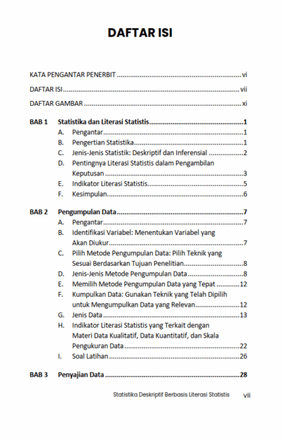 Berikut Daftar Isi Buku Pendidikan yang berjudul Buku Statistika Deskriptif Berbasis Literasi Statistis: Teori dan Aplikasi di Bidang Pendidikan, diantaranya: