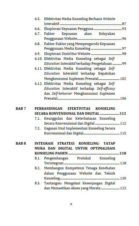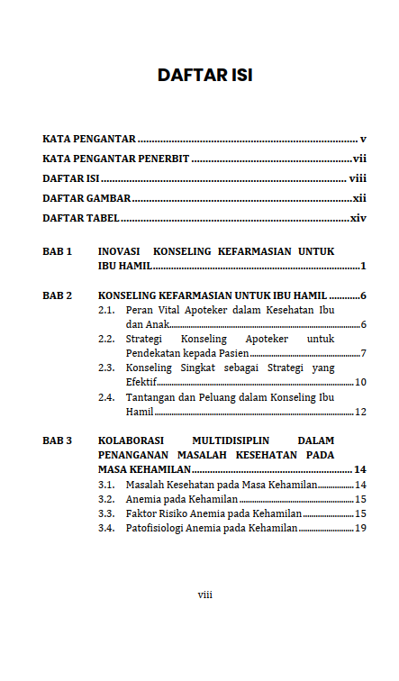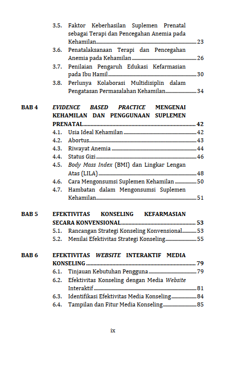 Berikut Daftar Isi Buku Farmasi yang berjudul Buku Strategi Konseling Kefarmasian Ibu Hamil : Tatap Muka dan Digital, diantaranya: