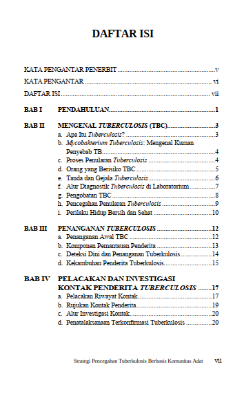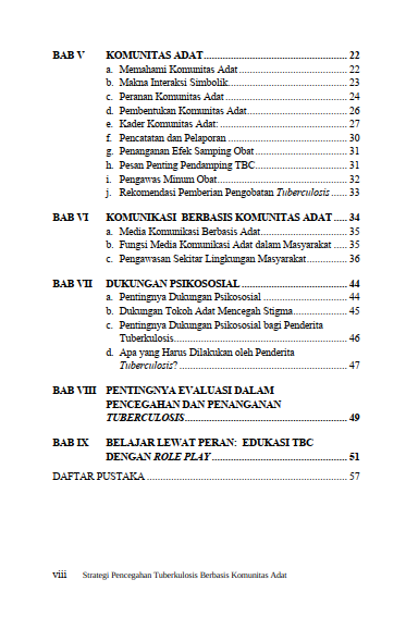 Buku ini disusun sebagai upaya memberikan pemahaman kepada pembaca mengenai Strategi Pencegahan Tuberculosis Berbasis Komunitas Adat. Buku ini dapat menjadi panduan praktis dalam upaya pencegahan TB dengan pendekatan kearifan lokal, isinya membahas pendahuluan TB, landasan teori dan konsep pencegahan, hingga strategi implementasi di tingkat komunitas adat. Selain itu, naskah ini juga menyoroti peran tokoh adat, keluarga, dan masyarakat dalam mendukung keberhasilan program pencegahan.