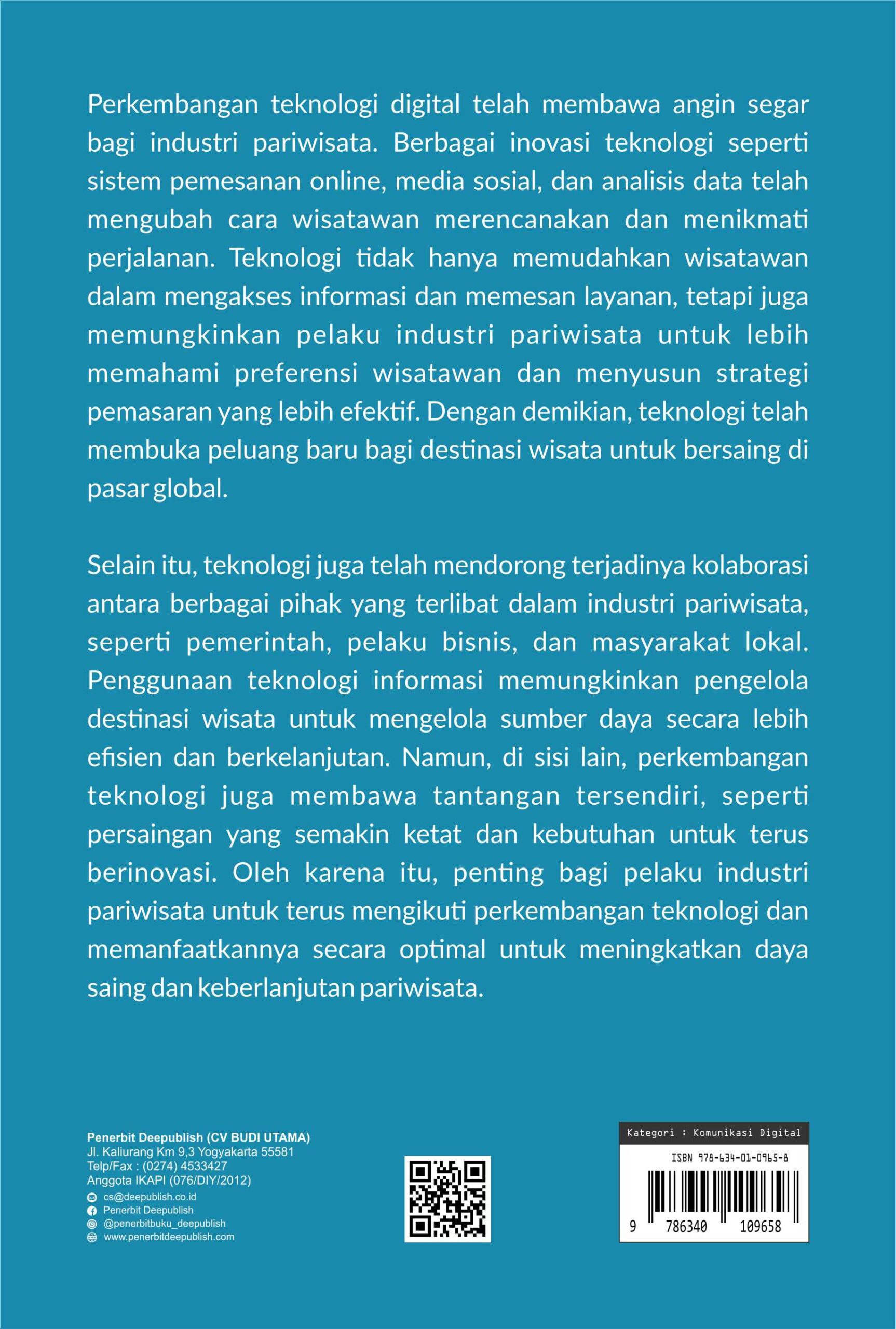 Buku Pariwisata yang berjudul Buku Sustainability Digital Communicatian Transformasi Desa Wisata Menuju Keberlanjutan merupakan karya Yani Hendrayani, Uljanatunnisa, Neni Rosmawarni dan Mansur. Perkembangan teknologi digital telah membawa angin segar bagi industri pariwisata. Berbagai inovasi teknologi seperti sistem pemesanan online, media sosial, dan analisis data telah mengubah cara wisatawan merencanakan dan menikmati perjalanan. Teknologi tidak hanya memudahkan wisatawan dalam mengakses informasi dan memesan layanan, tetapi juga memungkinkan pelaku industri pariwisata untuk lebih memahami preferensi wisatawan dan menyusun strategi pemasaran yang lebih efektif. Dengan demikian, teknologi telah membuka peluang baru bagi destinasi wisata untuk bersaing di pasar global.