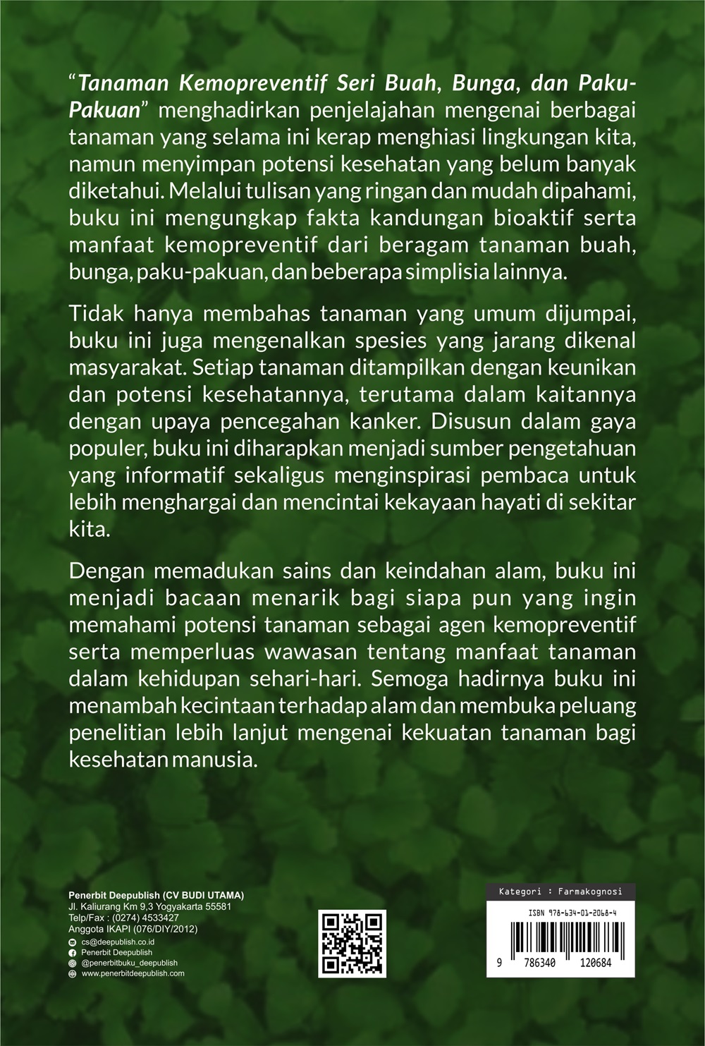 Buku Tanaman Kemopreventif Seri Buah, Bunga, dan Paku-Pakuan diterbitkan oleh Penerbit Buku Pendidikan Deepublish.