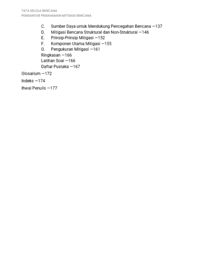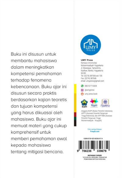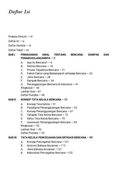 Buku ini digunakan sebagai bahan ajar dalam perkuliahan Tata Kelola Bencana di perguruan tinggi. Buku ajar ini dapat dijadikan sebagai pengantar untuk memahami fenomena kebencanaan dan pengurangan risiko bencana bagi mahasiswa. Dalam buku ajar ini, dijelaskan berbagai materi tentang fenomena kebencanaan yang diarahkan kepada pengurangan risiko bencana. Berbagai materi yang disajikan dalam buku ini, yaitu pemahaman awal tentang bencana, dampak dan penanggulangan bencana, konsep tata kelola penanggulangan bencana, dan mitigasi bencana.
