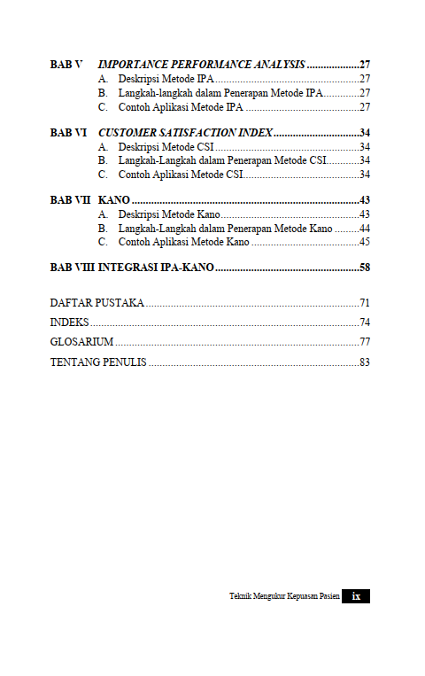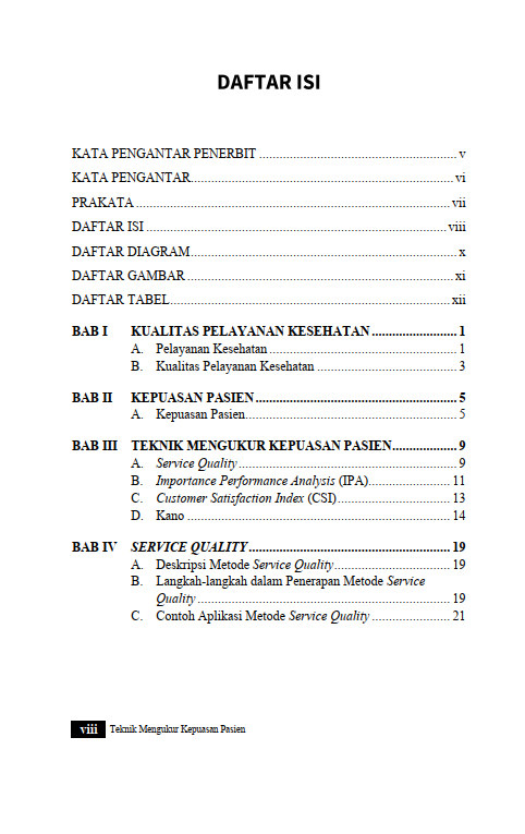 Berikut Daftar Isi Buku Kesehatan Masyarakat yang berjudul Buku Teknik Mengukur Kepuasan Pasien, diantaranya: