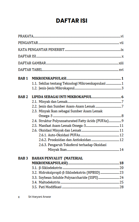 Berikut Daftar Isi Buku Teknologi Pangan yang berjudul Buku Teknologi Mikroenkapsulasi Pangan: Teori dan Aplikasinya pada Minyak Ikan, diantaranya: