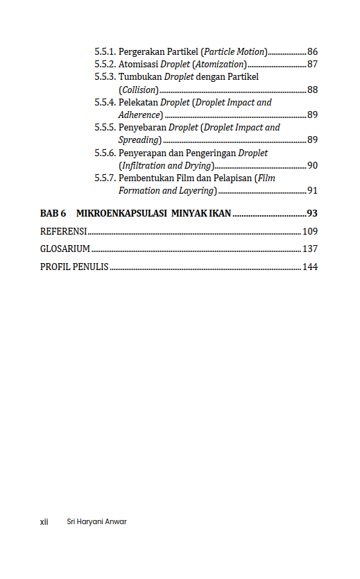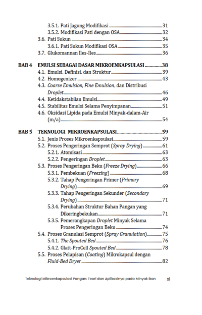 Selanjutnya, dibahas berbagai jenis bahan penyalut yang relevan untuk minyak ikan, diikuti penjelasan detail mengenai pembentukan emulsi yang stabil antara senyawa bioaktif dan bahan penyalut, dilengkapi contoh penelitian. Bagian inti buku ini menguraikan empat teknik mikroenkapsulasi pengeringan emulsi: pengeringan semprot, pengeringan beku, spray granulation, dan pelapisan mikrokapsul. Pemilihan teknik ini didasarkan pada pengalaman penulis. Buku ini diakhiri dengan rangkuman materi terkait mikroenkapsulasi minyak ikan, mencakup pemilihan bahan, dan proses hingga karakteristik produk akhir.