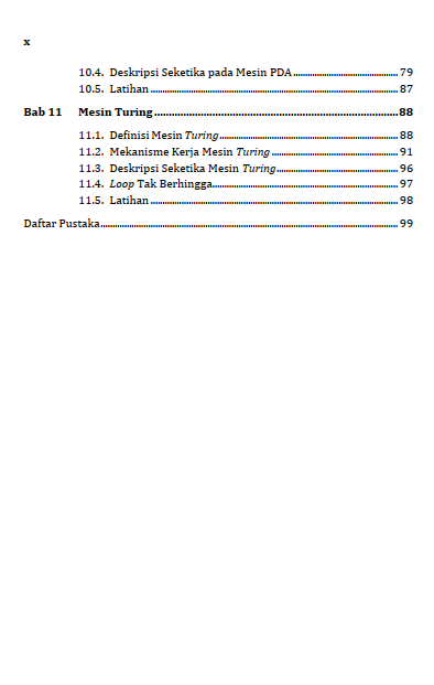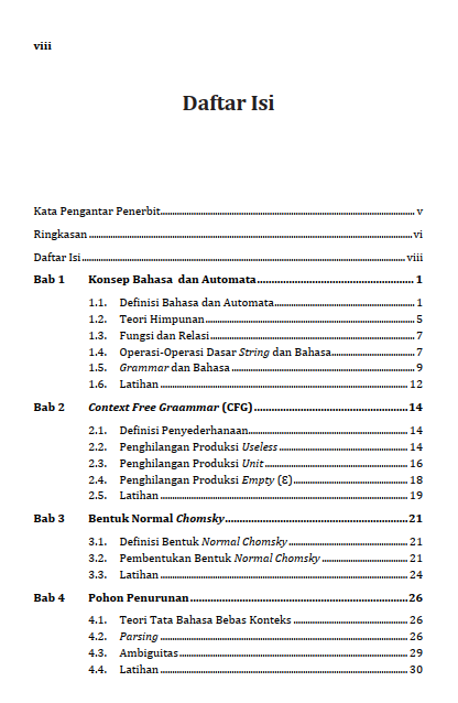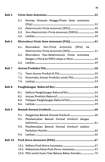 Melalui 11 bab pembahasan, pembaca diajak mengenal struktur bahasa, bentuk-bentuk dasar penyusunannya, cara sebuah mesin sederhana bekerja mengikuti aturan, hingga bagaimana konsep-konsep tersebut berkembang menjadi fondasi berbagai teknologi modern. Buku ini cocok bagi siapa pun yang ingin memahami dunia bahasa formal dan otomata dengan cara yang jelas, praktis, dan tidak berbelit-belit.