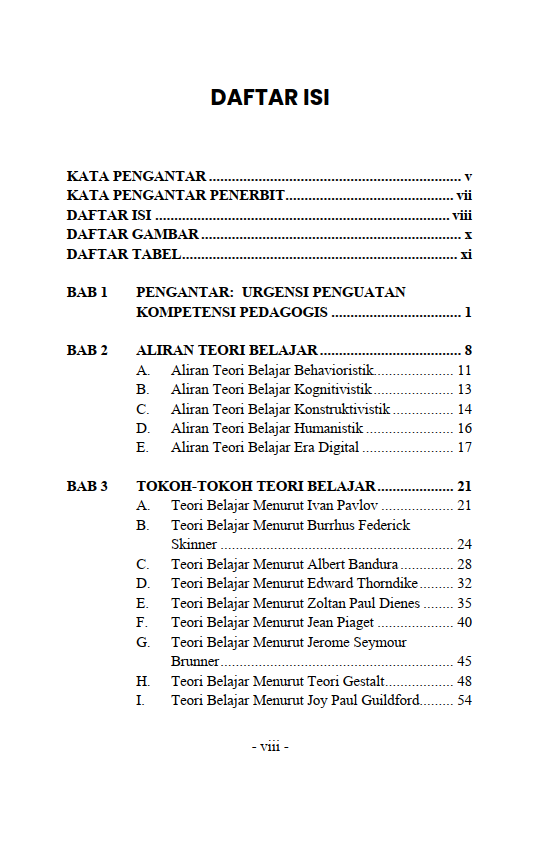 Secara sistematis, buku ini terdiri atas empat bab utama. Bab pertama mengulas urgensi penguatan kompetensi pedagosis, khususnya dalam pembelajaran matematika. Bab kedua membahas tentang aliran teori belajar, mulai dari teori belajar behavioristik, teori belajar konstruktivis, teori belajar kognitivistik, teori belajar humanistik, hingga teori belajar era digital. Bab ketiga membahas pula teori belajar dan penerapannya dari berbagai tokoh, mulai dari Pavlov, Skinner, Bandura, dan sebagainya. Bab terakhir berisi penjelasan tentang nilai-nilai Islam yang memperkuat praktik pedagogis guru dalam perspektif spiritual. Dengan mengedepankan pendekatan praktis dan teoretis yang seimbang, buku ini dapat menjadi panduan serta referensi bagi dosen, pendidik, mahasiswa, maupun peneliti yang ingin memperdalam pemahaman pedagogi dalam pembelajaran matematika yang kontekstual, reflektif, dan berbasis nilai. Buku Teori Belajar dan Pembelajaran Matematika: Penguatan Kompetensi Pedagogis sangat cocok bagi mahasiswa, dosen, guru, dan praktisi pendidikan dalam menjalankan peran sebagai pendidik profesional dan berintegritas.