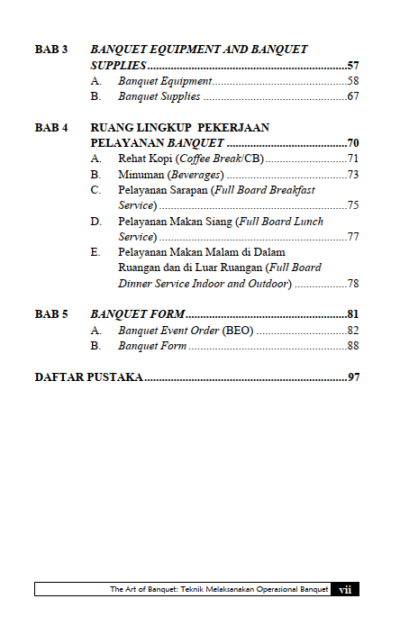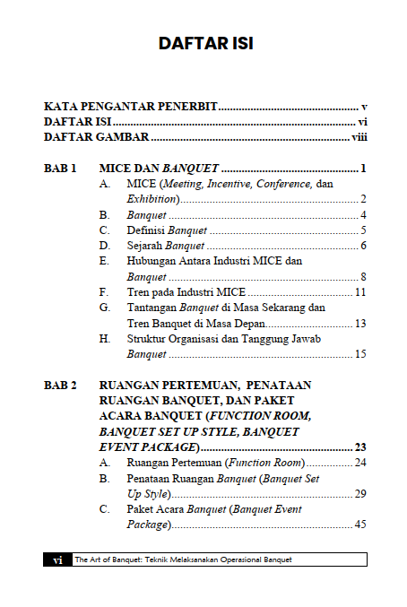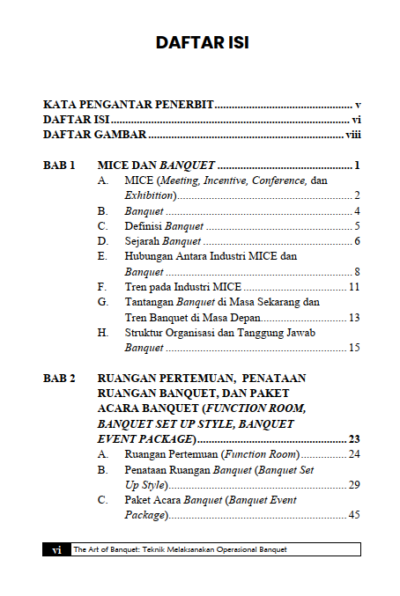 Berikut Daftar Isi Buku Perhotelan yang berjudul Buku The Art of Banquet: Teknik Melaksanakan Operasional Banquet, diantaranya: