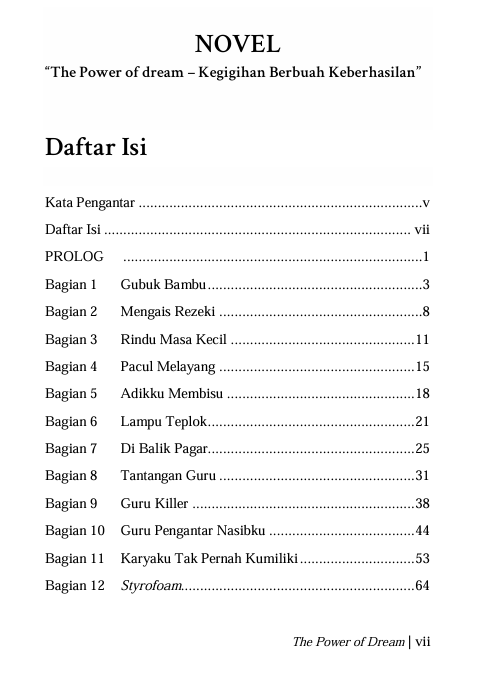 Berikut Daftar Isi Buku Motivasi yang berjudul Buku The Power Of Dream – Kegigihan Berbuah Keberhasilan, diantaranya: