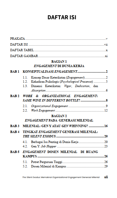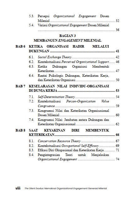 Melalui uraian yang runtut, buku ini membedakan keterikatan pada pekerjaan dengan keterikatan pada organisasi. Tidak semua orang yang bekerja dengan penuh energi otomatis merasa terhubung dengan institusinya. Di sinilah “silent exodus” terjadi. Bukan dalam bentuk pengunduran diri massal, melainkan sikap menjaga jarak, bekerja sekadarnya, dan hilangnya rasa memiliki. Pembahasan tentang generasi milenial tidak berhenti pada label stereotip seperti job hopper, tetapi mencoba memahami latar nilai, harapan, dan pengalaman kerja yang membentuk sikap mereka terhadap organisasi.