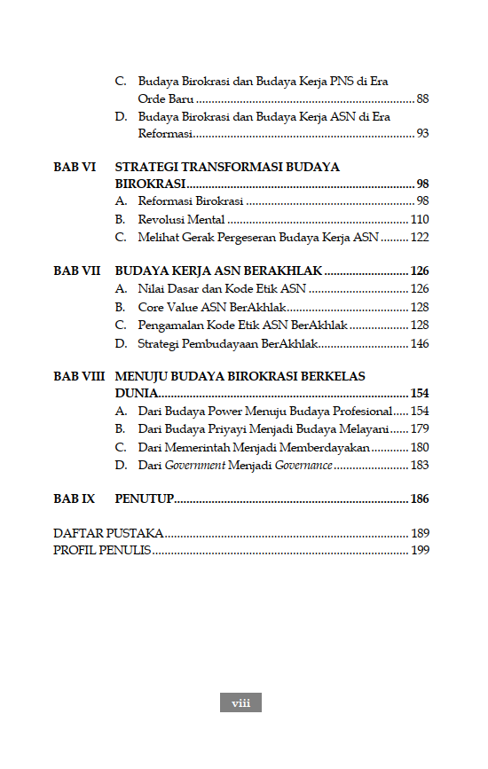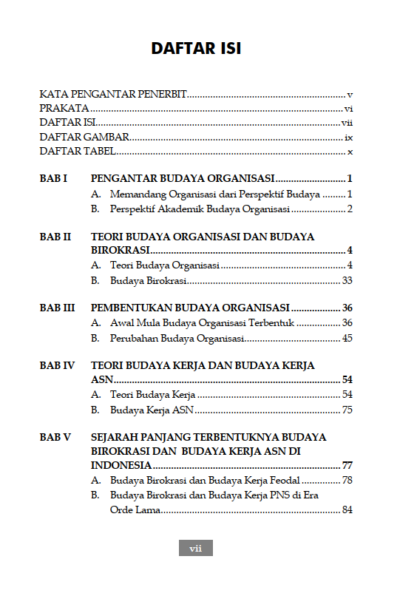 Berikut Daftar Isi Buku Administrasi Publik yang berjudul Buku Transformasi Budaya Organisasi Birokrasi dan Budaya Kerja ASN dari Budaya Power Menuju Budaya Profesional dari Budaya Priyayi Menuju Budaya Melayani, diantaranya: