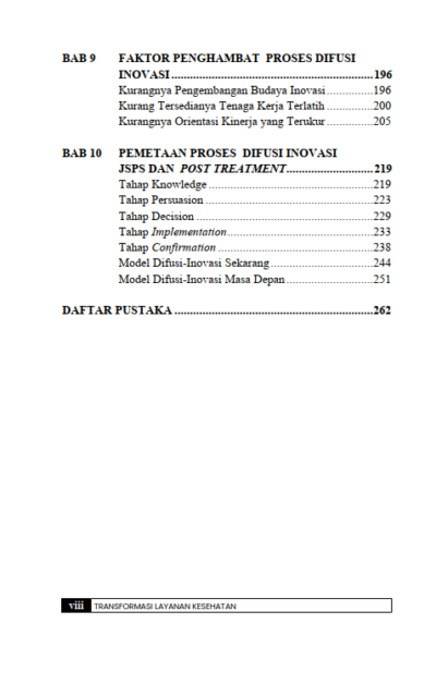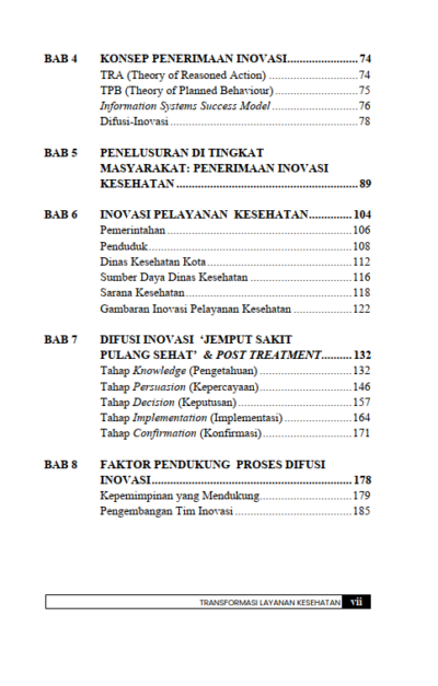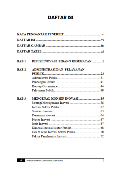 Sinopsis Buku Transformasi Layanan Kesehatan: Inovasi, Aksesibilitas, dan Kesejahteraan Masyarakat Buku Transformasi Layanan Kesehatan: Inovasi, Aksesibilitas, dan Kesejahteraan Masyarakat Buku Sosial dan Politik yang berjudul Buku Transformasi Layanan Kesehatan: Inovasi, Aksesibilitas, dan Kesejahteraan Masyarakat merupakan karya Novliza Eka Patrisia. Inovasi dalam sektor publik berperan penting dalam meningkatkan kinerja organisasi, mendukung pertumbuhan ekonomi, serta kesejahteraan masyarakat. Dalam bidang kesehatan, inovasi layanan diperlukan untuk meningkatkan akses, kualitas, dan efektivitas pelayanan kesehatan, yang merupakan hak dasar masyarakat sesuai dengan UUD 1945. Keberhasilan inovasi kesehatan dipengaruhi oleh berbagai faktor, seperti mekanisme difusi, peran teknologi, serta faktor psikologis individu dalam mengadopsi inovasi. Pemerintah menjadi contoh dalam menerapkan inovasi pelayanan kesehatan, dengan fokus pada strategi penyebaran yang optimal, peningkatan akses masyarakat, serta pemahaman terhadap manfaat layanan kesehatan. Melalui buku ini, penulis berusaha mengombinasikan beberapa teori penerimaan inovasi untuk dijadikan kacamata dalam memandang fenomena yang terjadi di masyarakat, serta sebaiknya model penerimaan layanan inovasi kesehatan itu dikembangkan. Buku ini diharapkan dapat memberikan wawasan praktis bagi pembuat kebijakan dalam meningkatkan efisiensi layanan publik dan merancang strategi implementasi inovasi yang sesuai dengan kondisi lokal. Berikut Daftar Isi Buku Sosial dan Politik yang berjudul Buku Transformasi Layanan Kesehatan: Inovasi, Aksesibilitas, dan Kesejahteraan Masyarakat, diantaranya: