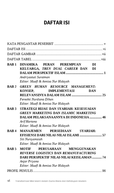 Buku ini mengangkat integrasi nilai-nilai Islam dalam berbagai aspek kehidupan, melalui peran perempuan dalam dual career dan keluarga islami dalam upaya menciptakan keseimbangan antara tanggung jawab keluarga dan karier profesional; green human resource management (GHRM) melihat bagaimana upaya perusahaan dapat mengintegrasikan prinsip kelestarian lingkungan dengan praktik manajemen sumber daya manusia; keselarasan green marketing dan islamic marketing mengungkap bagaimana strategi pemasaran berkelanjutan dapat sejalan dengan nilai-nilai islami; manajemen persediaan berbasis syariah memaparkan prinsip keadilan, transparansi, dan tanggung jawab sosial dalam pengelolaan persediaan; dan reverse logistics dan remanufacturing dalam Islam.