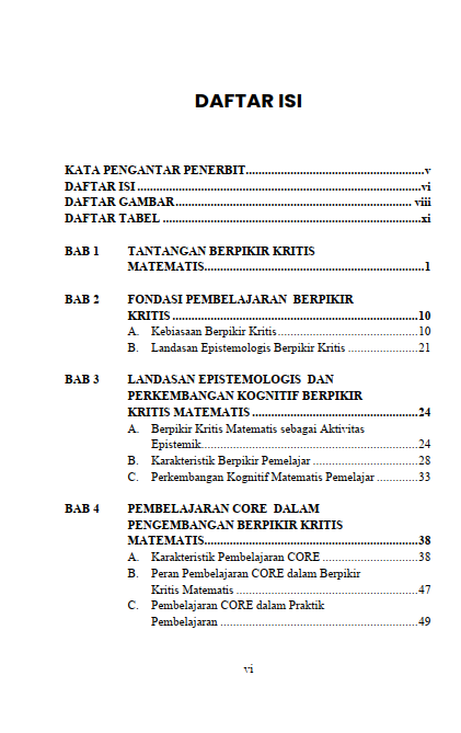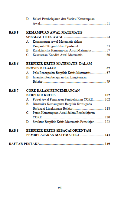 Buku ini menyoroti penerapan pembelajaran CORE (Connecting, Organizing, Reflecting, dan Extending) sebagai alternatif untuk mengembangkan kemampuan berpikir kritis matematis. Pembahasan disajikan secara sistematis dan mendalam untuk menggambarkan keterkaitan antara model pembelajaran, karakteristik institusi pendidikan, dan kesiapan awal pemelajar. Buku ini diharapkan menjadi rujukan konseptual dan praktis bagi pendidik, peneliti, serta pemerhati pendidikan matematika.