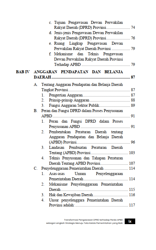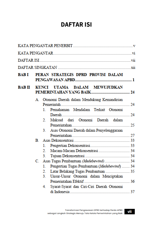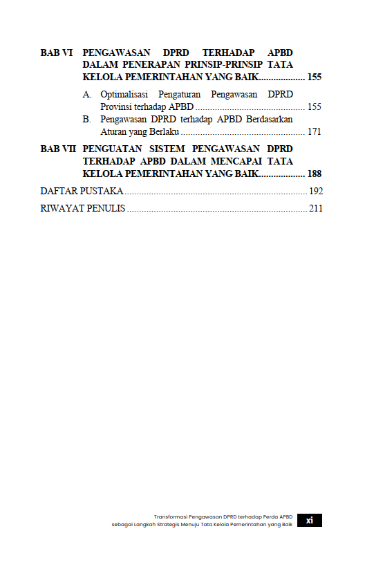 Berikut Daftar Isi Buku Hukum yang berjudul Buku Transformasi Pengawasan DPRD terhadap Perda APBD sebagai Langkah Strategis Menuju Tata Kelola Pemerintahan yang Baik, diantaranya: