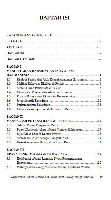 Berikut Daftar Isi Buku Biologi yang berjudul Buku Wajah Pesisir Zamrud Cenderawasih: Potret Fauna, Ekologi, Hingga Ekowisata, diantaranya: