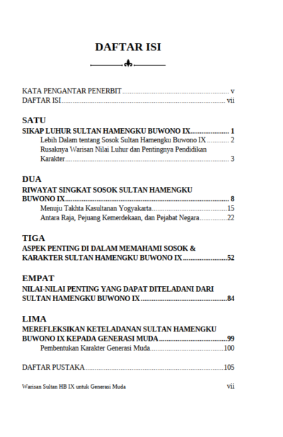 Berikut Daftar Isi Buku Sosial Budaya yang berjudul Buku Warisan Sultan HB IX untuk Generasi Muda, diantaranya: