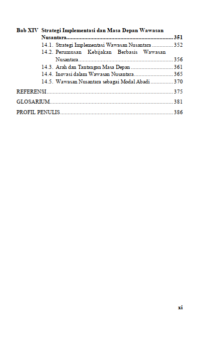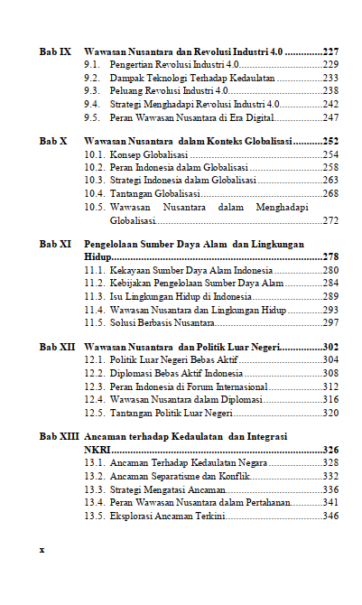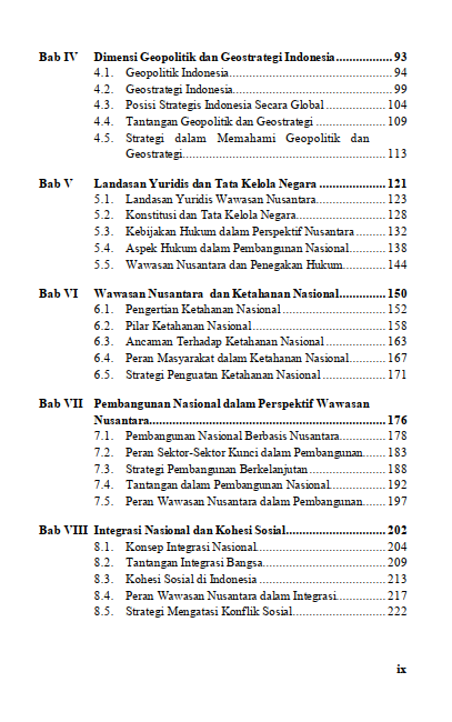 Melalui pembahasan yang sistematis dan komprehensif, buku ini menguraikan hakikat, tujuan, fungsi, dan prinsip-prinsip Wawasan Nusantara, sekaligus menegaskan perannya sebagai perekat kebhinekaan dalam masyarakat multikultural. Tidak hanya pada tataran konseptual, buku ini juga mengulas implementasi Wawasan Nusantara dalam berbagai aspek kehidupan nasional, meliputi bidang politik, hukum, ekonomi, sosial budaya, serta pertahanan dan keamanan, sebagai upaya nyata menjaga keutuhan Negara Kesatuan Republik Indonesia.