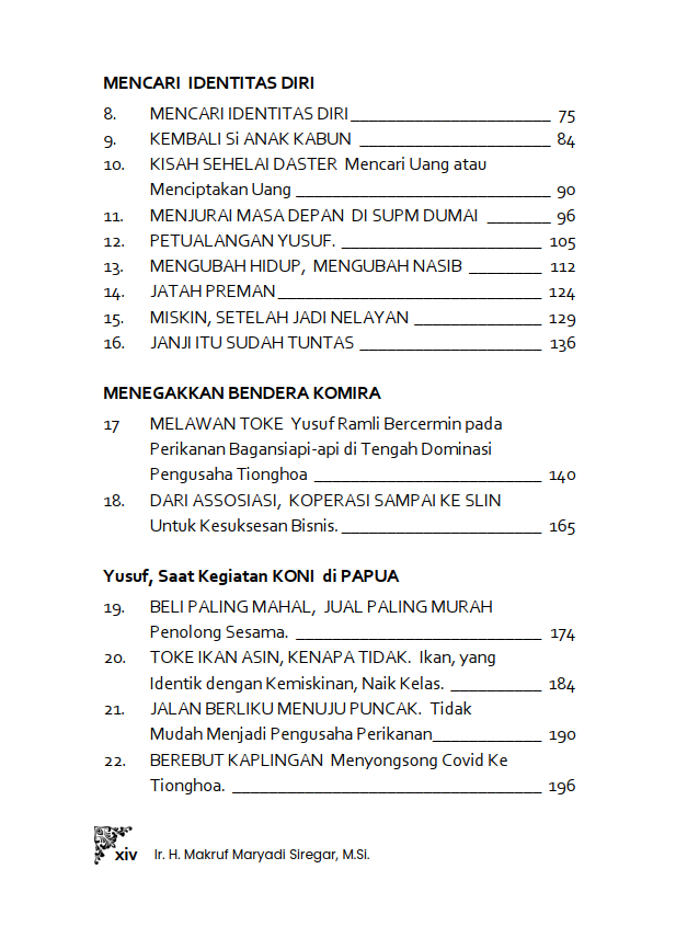 Itulah pegangan hidup bagi Yusuf Ramli, yang disapa Yusuf. Dia terinspirasi dengan Sungai Kampar, yang mengalir pelan tapi pasti di depan rumahnya, sebagai sumber kedamaian, perubahan, dan keberlanjutan kehidupan. Tidak ada masalah (kusuik) yang takkan selesai, tetaplah sabar menanti, air keruh (kowuo) itu akan jernih juga pada masanya. Oleh karenanya janganlah kita angkuh (mendongak), yang nanti bisa membuat kita tersungkur ke bumi. Begitu prinsip Yusuf Ramli, Direktur Utama PT Satya Trinadi Komira Perkasa, wirausahawan yang cukup dikenal di dunia perikanan tangkap, dan pengolahan ikan. Yusuf Ramli kelahiran Kampar-Riau, 15 Juni 1970 telah mengabdikan dirinya pada sektor perikanan. Pengabdian itu, bermula atas pilihan bersekolah di Sekolah Usaha Perikanan Menengah (SUPM) Dumai-Riau, dan lulus pada tahun 1989. Selanjutnya, Yusuf Ramli melanjutkan pendidikan di Akademi Usaha Perikanan (AUP) Jakarta, dan lulus pada tahun 1991. Beragam cobaan silih berganti mendera, membuat dia harus terus berjuang untuk melanggengkan bisnis perusahaannya di samping harus terus berupaya merengkuh peluang-peluang kejayaan melalui berbagai organisasi sosial, dan assosiasi bisnis yang menopang kegiatannya. Dia tidak pernah menyesali apa yang sudah terjadi dalam hidupnya. Karena tanpa kisah itu, Yusuf tidak akan mengenal apa arti dari sebuah kekuatan, kesabaran dan keikhlasan. Yusuf, juga tidak membiarkan kebencian merusak hatinya. “Maafkan, tapi jangan lupakan pelajarannya”