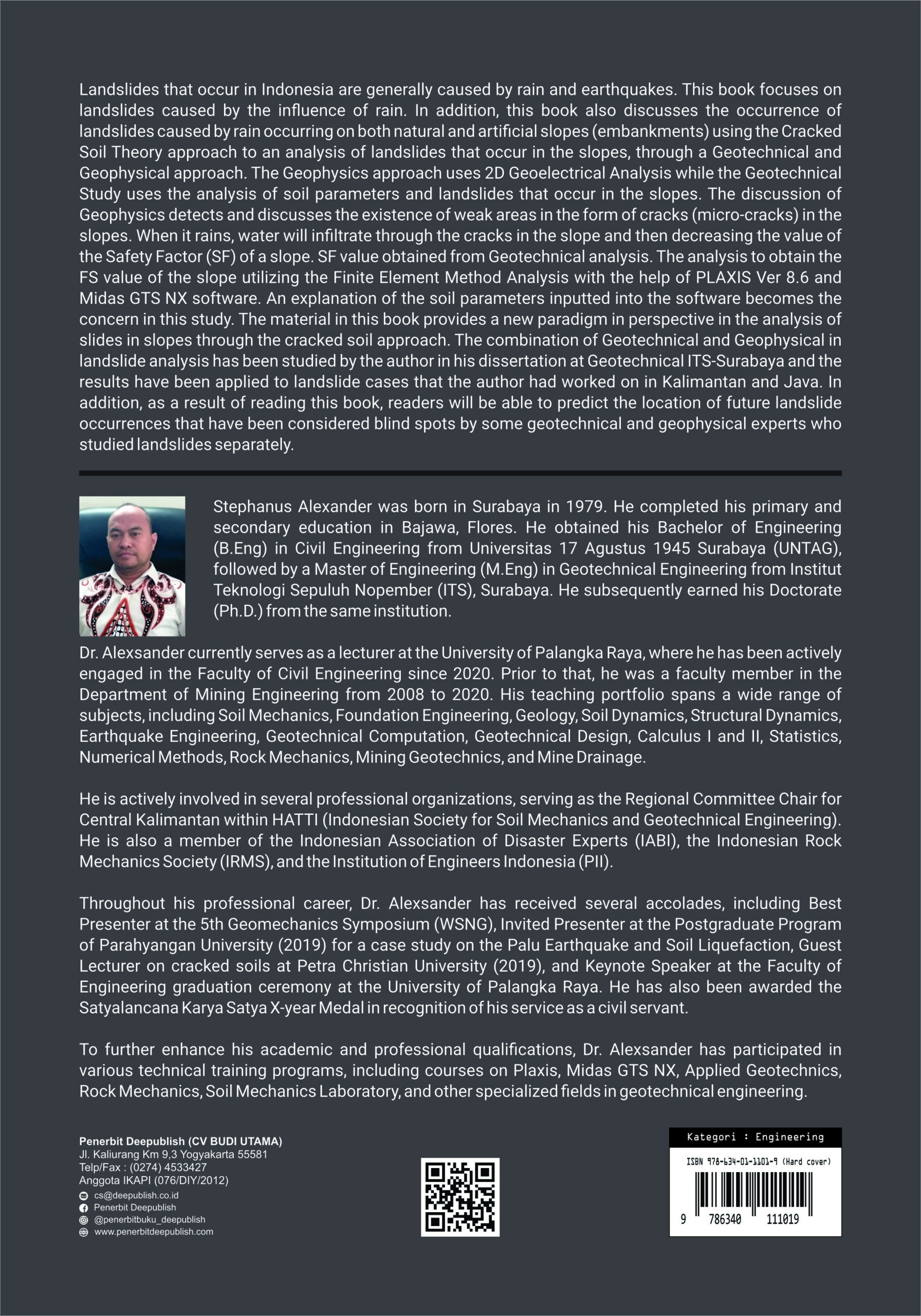 Book Specifications Field of Science : Engineering Author : Stephanus Alexsander Page : xxvi, 157 hlm, Uk: 17.5×25 cm ISBN : 978-634-01-1101-9 (Hard Cover) Year : 2025 Combination of Geotechnical and Geophysics for Landslide Analysis Using Cracked Soil Approach Theory And Analysis Book is publish by Deepublish Publisher Get quality books only at Deepublish Online Bookstore Deepublish. We focus on selling college books to students throughout Indonesia, with the most complete selection you are sure to get the book you are looking for. Our advantages: