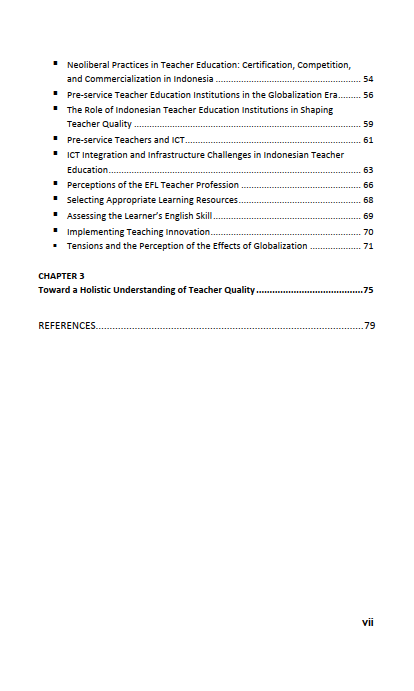 This book explores the concept of quality in English as a Foreign Language (EFL) teacher education within Indonesia’s evolving educational landscape. It examines how the idea of a quality teacher is shaped by various influences, including global educational trends, national values, and local cultural contexts. The discussion situates teacher education as a dynamic space where international standards and local philosophies meet and interact.